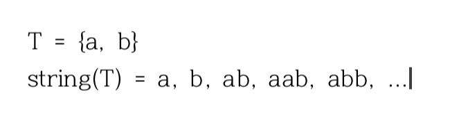 - T^*(Tstar) : 티스타는 empty 스트링을 포함하여 알파벳 T로부터 만들 수 있는 모든 스트링의 집합을 말한다.