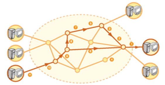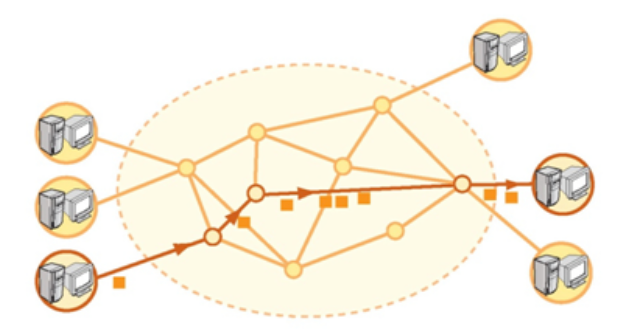 패킷 교환은 송신자가 데이터들을 뿌리면 여러 라우터들을 거쳐서 수신자에게 도착하게 되고, 이를 모아서 데이터를 해석하는 방식이다. 정해진 회선이 없으므로 쪼개진 데이터들이 알아서 찾아가게 된다.