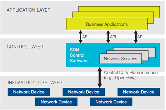 SND은 Apllication Layer / Control Layer / Infrastructure Layer 3계층 구조로 표현 가능하다. 그리고 계층들을 연결하는 것이 앞서 얘기했던 Open Flow이다.